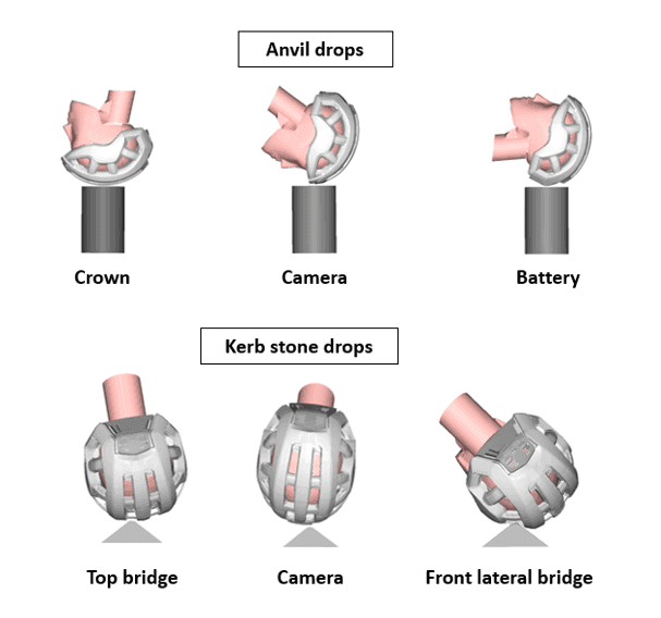 The helmet is dropped in a guided fall much like our inhouse drop rig which guides the headform so that it hits the anvil(s) correctly. The image on the left shows the relevant loadcases.