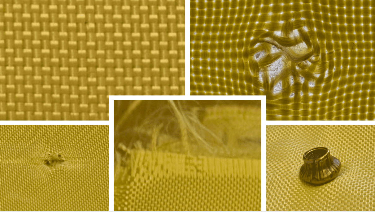 Typically, soft armour consists of several stacked layers of woven fabric, ten or more. Here we focus on woven Aramid fabric. The layers can be held together by quilting and are contained in a sleeve to form what is referred to as a 'firing pack'. Aramid fibres are quite slippery and the woven fabric frays easily.