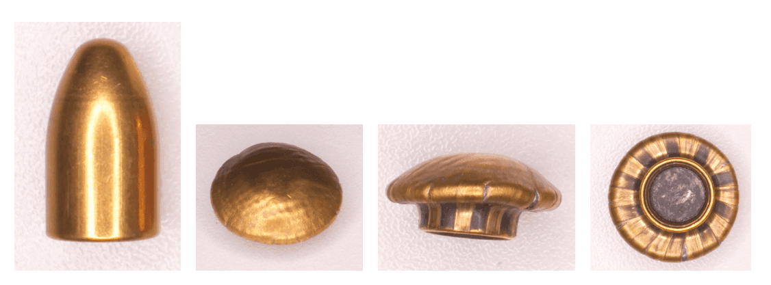 When defeated by impact with a soft armour, i.e. layers of fabric, it has changed into a mushroom shape. Notice the front face of the bullet head where you can see the imprint from the texture of the fabric. In the rear view of the mushroomed bullet, you can clearly see the lead core and the markings from the rifling of the gun barrel.